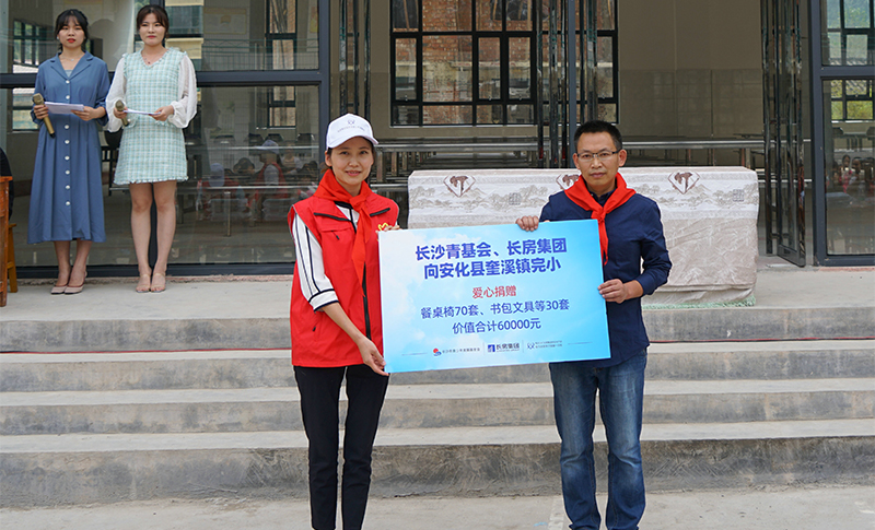 “金色的駝鈴,叮當(dāng)叮當(dāng),小駱駝帶著它走向遠(yuǎn)方,追趕著春天的腳步叮當(dāng),走向綠色的希望?!敝赡矍宕嗟母杪曉诎不h奎溪鎮(zhèn)完全小學(xué)校園里響起,融化著眾人的心。2019年9月25日,長(zhǎng)沙青基會(huì)與長(zhǎng)房集團(tuán)共同舉行的“大愛奎溪完小、情暖校園食堂”愛心餐桌椅捐贈(zèng)儀式在安化縣奎溪鎮(zhèn)完小舉行。儀式現(xiàn)場(chǎng),長(zhǎng)房集團(tuán)“藍(lán)絲帶”愛心傳遞基金向?qū)W校捐贈(zèng)了70套餐桌椅,并給學(xué)校30名貧困學(xué)生帶來了書包、文具等新學(xué)期禮物,本次愛心捐贈(zèng)價(jià)值60000元。長(zhǎng)房集團(tuán)黨群工作部負(fù)責(zé)人,長(zhǎng)沙市青少年發(fā)展基金會(huì)辦公室負(fù)責(zé)人,長(zhǎng)房集團(tuán)十余名青年志愿者,安化縣教育基金會(huì)、奎溪鎮(zhèn)政府、奎溪鎮(zhèn)中心學(xué)校的領(lǐng)導(dǎo)及奎溪鎮(zhèn)完小師生代表出席了捐贈(zèng)儀式。
