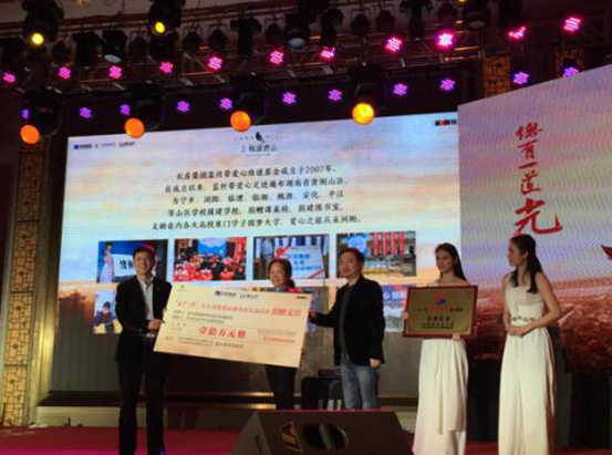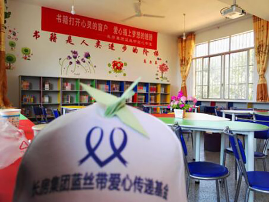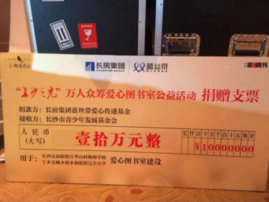 2016年初,晨報(bào)周刊攜手長房梅溪香山、長房集團(tuán)藍(lán)絲帶愛心傳遞基金共同發(fā)起“萬人眾籌圖書館”愛心公益活動(dòng),為湖南貧困山區(qū)學(xué)校捐建圖書室。以點(diǎn)亮希望之光、傳遞溫暖力量為主題的“長沙之光”微信文稿每被轉(zhuǎn)發(fā)一次,即為籌建山區(qū)學(xué)校愛心圖書室捐贈(zèng)5元?;顒?dòng)開展以來,贏得了許多社會(huì)愛心人士的熱烈反響和廣泛共鳴,共有1萬余人次參與活動(dòng),最終,通過長房集團(tuán)藍(lán)絲帶愛心傳遞基金捐款10萬元,用于長沙縣福臨鎮(zhèn)古華山村梅林小學(xué)和寧鄉(xiāng)縣灰湯鎮(zhèn)洞庭橋完全小學(xué)兩所貧困學(xué)校愛心書屋的建設(shè),長沙市基少年發(fā)展基金會(huì)理事長羊舒麟代表兩所學(xué)校接收捐贈(zèng)。